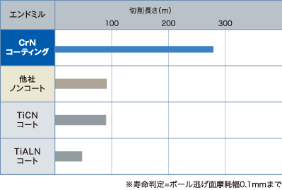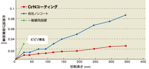 CrNコーティングを施したCRN-EMSは、高速ドライ切削においても切れ刃摩耗の進行が遅く、